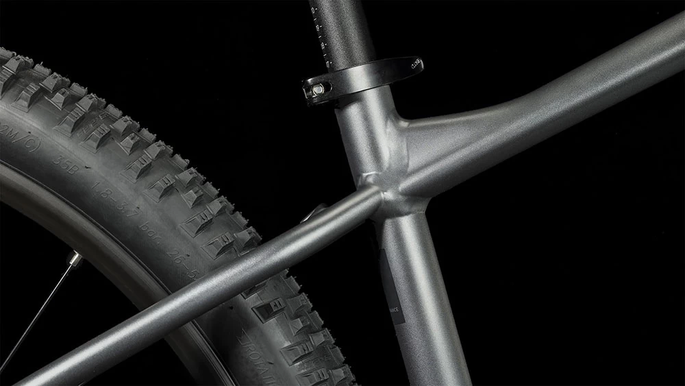 Der brandneue Aim Rahmen besticht mit einem überarbeiteten, supercleanen Look. Verantwortlich dafür: die im Smooth Welding Verfahren hergestellten Verbindungen am Steuerrohr und Sattelstützenprofil. Außerdem hat Cube ihm ein geschraubtes Tretlager gegeben und die Züge ins Innere verlegt, damit sie ihre Aufgabe lange machen und leicht gewartet werden können. Es gibt sogar eine Aufnahme für eine Flat-Mount-Scheibenbremse, die nahtlos in die Seitenständeraufnahme integriert ist. Montagepunkte für ACID Schutzbleche und Gepäckträger sind auch mit dabei. Die überarbeitete Geometrie hat ein niedrigeres Oberrohr für noch zuverlässigeres Handling und lässt viel Platz für breite, griffige, komfortabel rollende 2.25 Zoll Reifen. Auch das SizeSplit System ist jetzt breiter aufgestellt – dadurch findet jeder und jede die perfekt passende Aim Rahmengröße für sich.