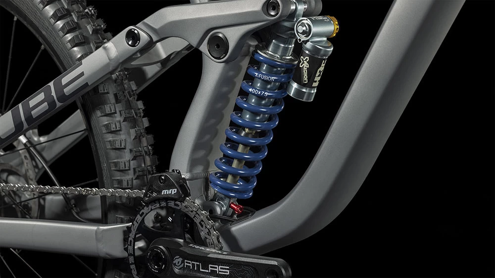 Das Two15 Pro schert sich rein gar nichts um Gravitation und Co! Das muss es auch nicht, denn CUBE hat diesem Downhill-Geschoss eine X-Fusion Dual-Crown RV-1 HLR Federgabel mit satten 200 mm Federweg für ultimative Kontrolle und erstklassiges Handling verpasst. Und einen X-Fusion H3-C DH Dämpfer, bei dem Kompression und Rebound am Hinterbau verstellt werden können.