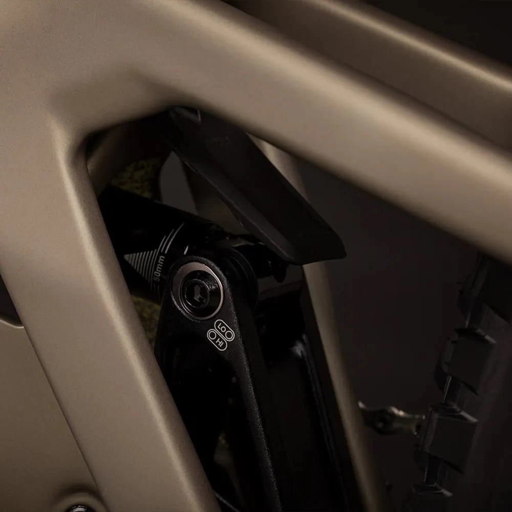 Ein kleines Fenster erleichtert das Abstimmen des Hinterbaus. Weitere schöne Details sind das Schutzblech, das den Dämpfer vor Dreck schützt, die saubere Leitungsführung im Rahmen, sowie der gummierte Unterrohr-Schutz.