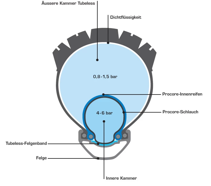 - PROCORE – die äußere Kammer: Die Außenkammer ist Tubeless. Als Reifen kann jeder MTB-Reifen verwendet werden, der tubelessfähig ist. Der Reifen wird mit etwas Dichtflüssigkeit befüllt (ca. 60 ml). Er sollte mindestens 57 mm (2.25“) breit sein.