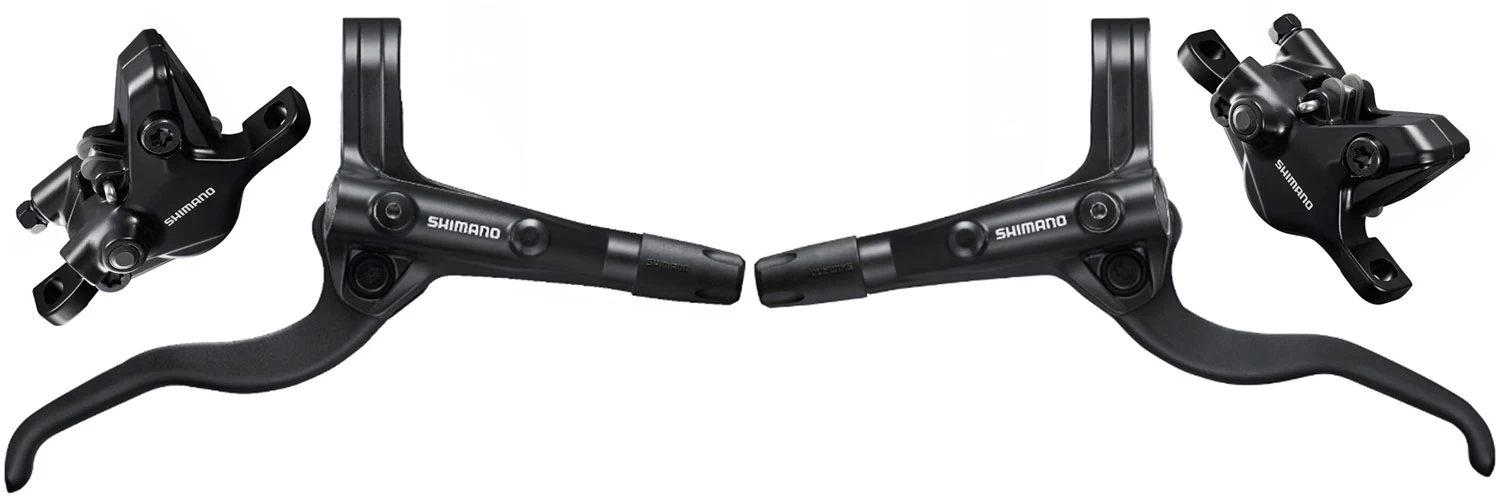 Die hydraulische 2-Kolben-Scheibenbremse von Shimano mit ergonomischen BL-MT401 2-Finger-Bremshebel und BR-MT410 Bremssattel für ausgewogene Bremsleistung, stellt den Maßstab für kostengünstige Performance-Bremssysteme da.