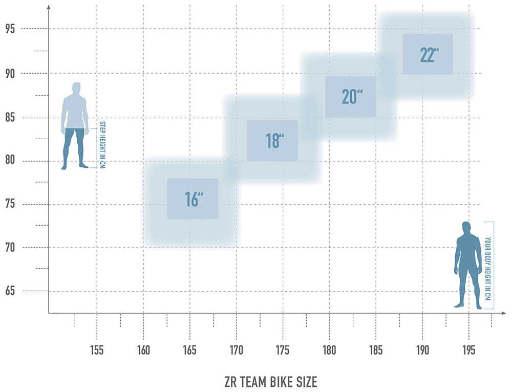 Mit Hilfe unserer Grafik wollen wir Dir eine Empfehlung bei der Suche nach Deiner richtigen Rahmengröße geben. Neben Schrittlänge sowie Körpergröße spielt natürlich auch Dein persönlicher Fahrstil, Einsatzbereich sowie Vorliebe eine große Rolle. Wenn Du mit Deinen Angaben im Grenzbereich liegen solltest, kannst Du zwischen zwei Rahmenhöhen wählen: die kleinere Rahmengröße ist agiler/wendiger/verspielter, die nächstgrößere Rahmenhöhe laufruhiger/spurtreuer und hat im Uphill die Nase vorn.